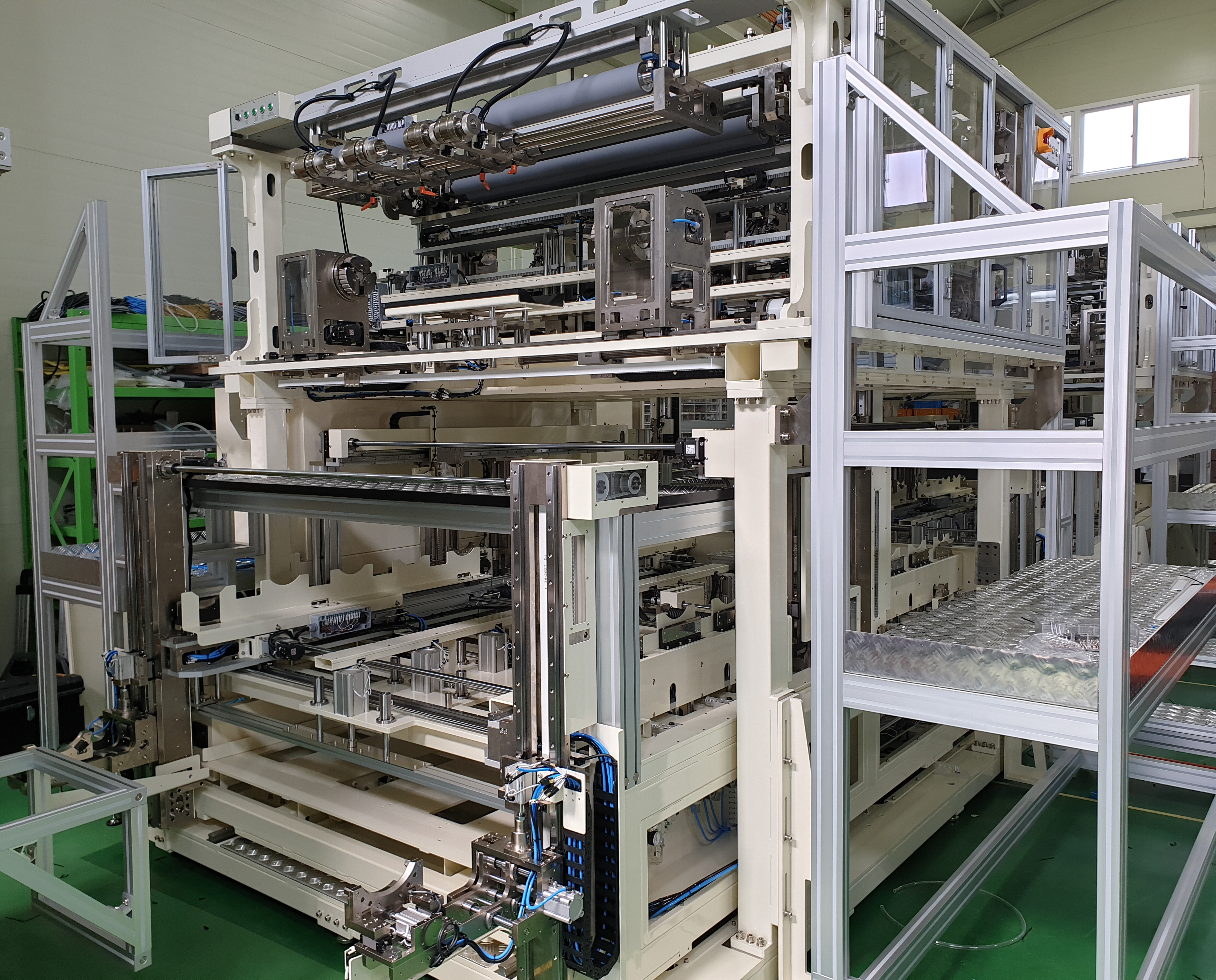 2차전지 분리막 코팅공정 투입부로 원단 스플라이싱시 필요로 하는 초기 작업 (OPP 테이프 부착 / 양면테이프부착 / 마감스티커 부착)후 터렛장비에 원단공급하는 장치.
