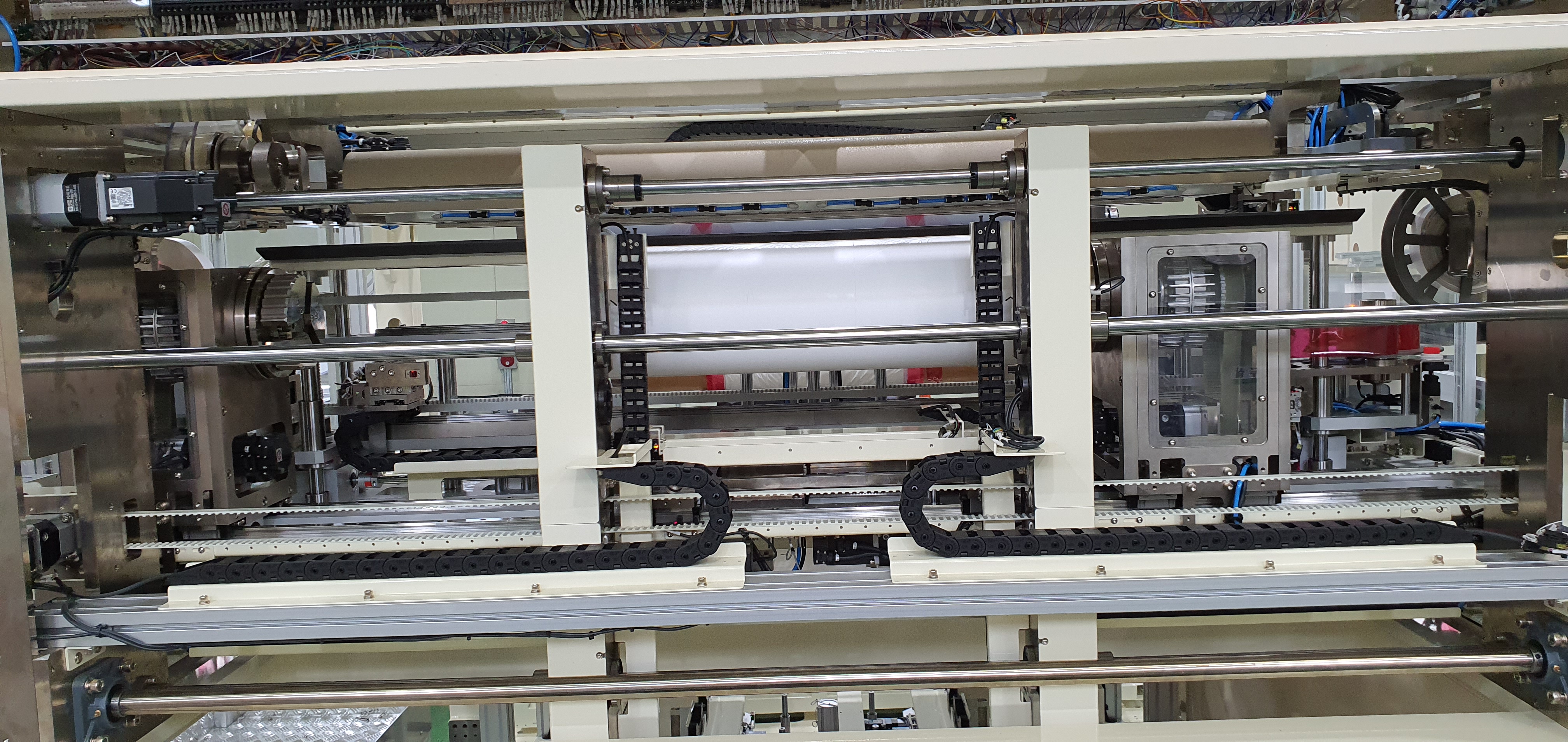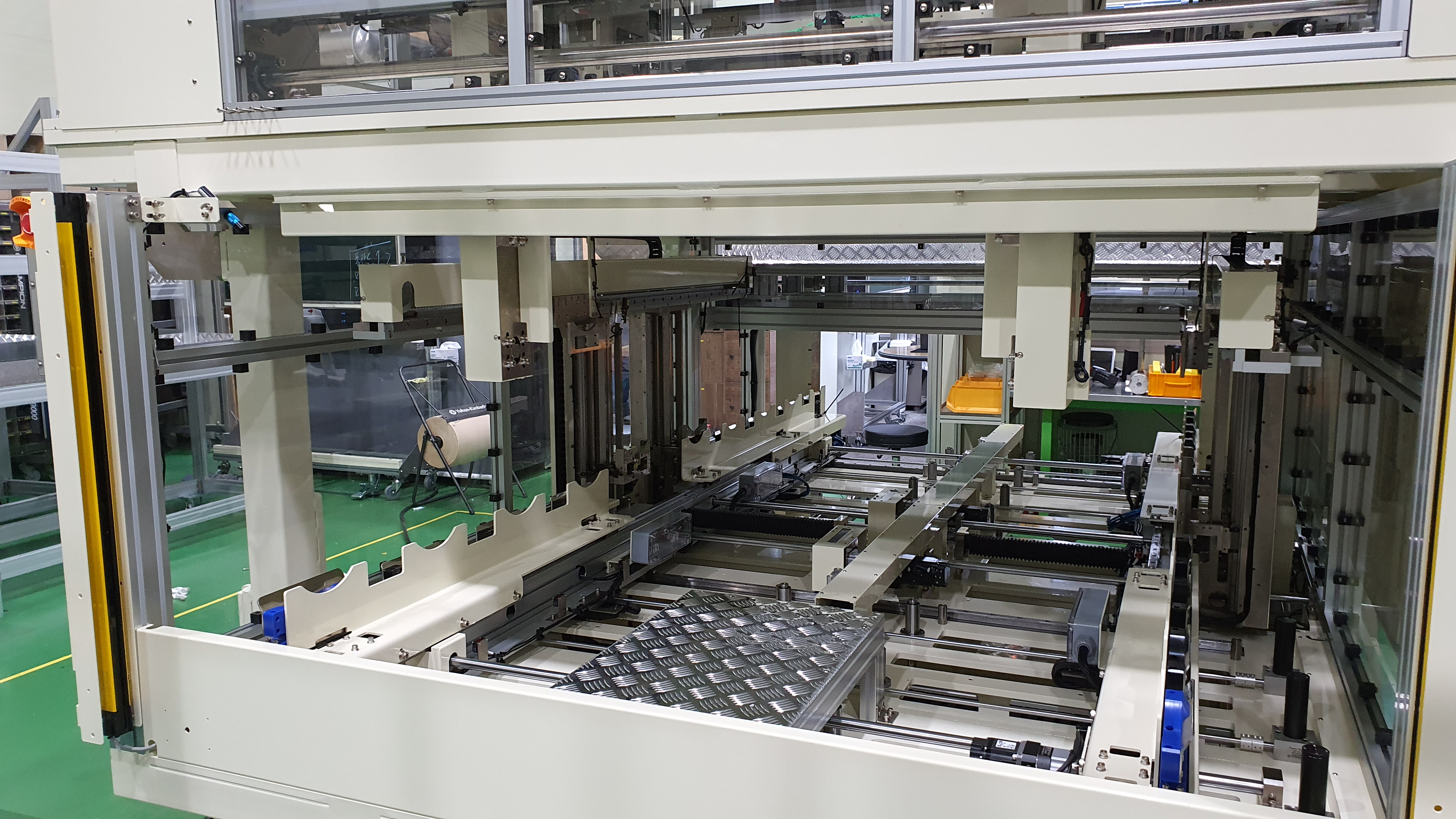 2차전지 분리막 코팅공정 투입부로 원단 스플라이싱시 필요로 하는 초기 작업 (OPP 테이프 부착 / 양면테이프부착 / 마감스티커 부착)후 터렛장비에 원단공급하는 장치.
