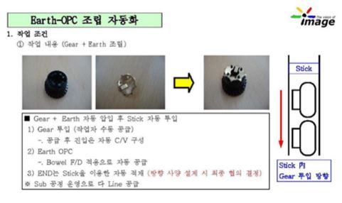 | 장비 개요 | Feeder 에서 공급된 Earth 를 정열하여 OPC 기어에 압입 / 조립 후 Stick 에 자동으로 삽입하는 장비 |